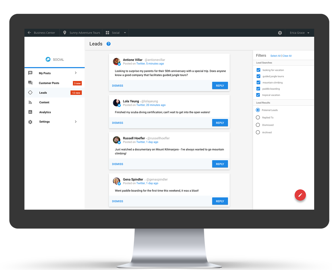 - Lead finder—Configure keyword searches and geo targeting to find and engage with your target audience