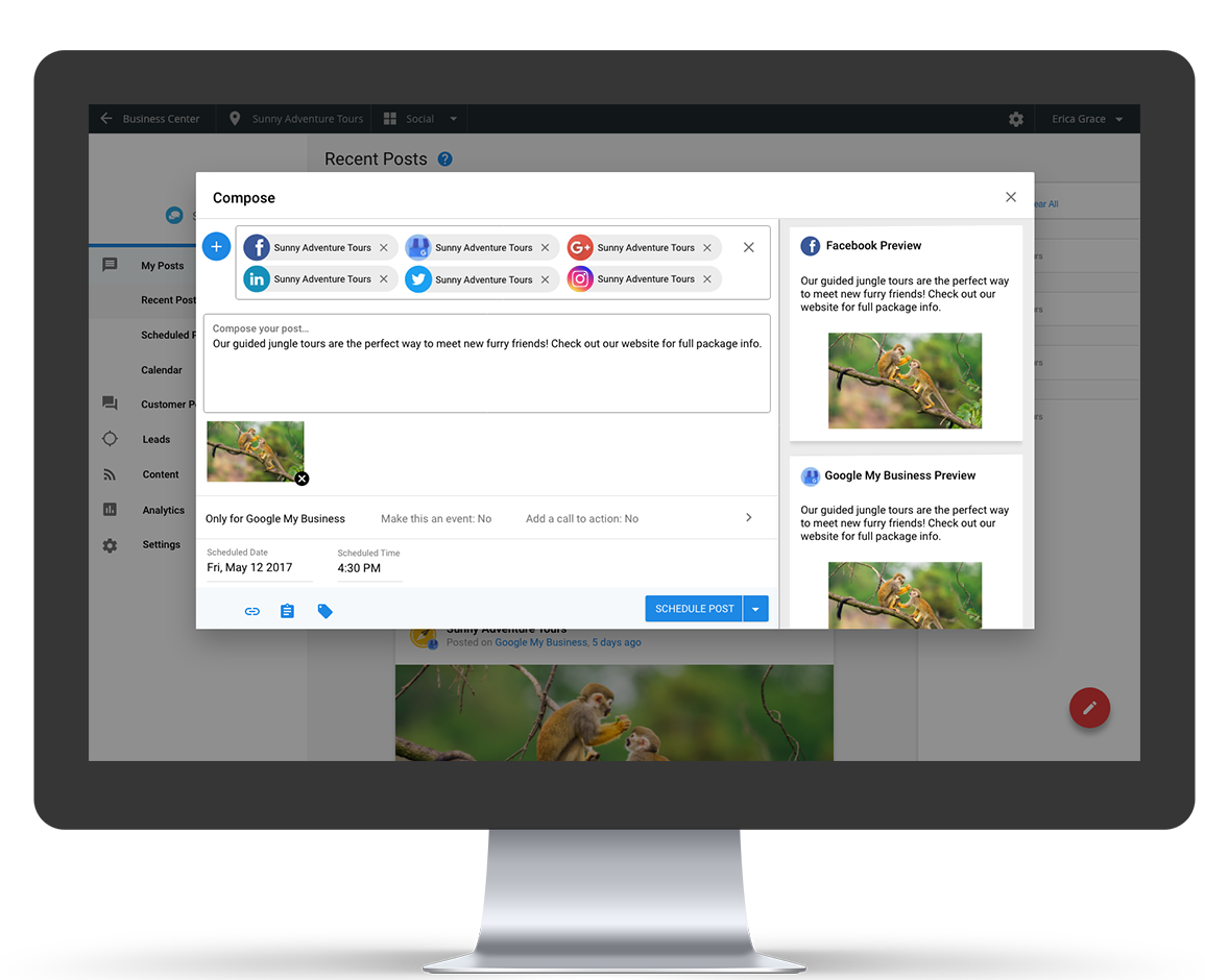 - All-in-one composer—Post to Facebook, Instagram, Twitter, Google My Business, and LinkedIn